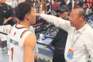 比賽結(jié)束后,場邊發(fā)生了一個小插曲,上海男籃球員李添榮想和場邊的球迷擊掌互動,但是遭到北京主場工作人員的攔截。