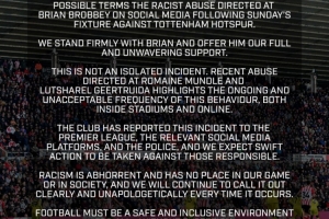 俱樂部已將此事報告給英超聯賽、相關社交媒體平臺以及警方,我們期望能迅速對責任人采取行動。種族主義是可憎的,在我們的足球運動和整個社會中沒有立足之地,只要此類事件發生,我們就會繼續清晰且毫不妥協地予以譴責。足球必須為所有人提供一個安全且包容的環境——毫無例外。”