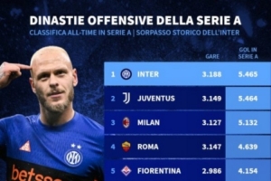 體育資訊4月13日訊 德國轉會市場統計了各隊在意甲的歷史進球總數量,并列出榜單,國米打進5465球,超越尤文居首。