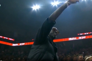 加內特——這位入選名人堂的球員、森林狼幾乎所有核心數據隊史第一人,在本場球員入場儀式結束后,隨同森林狼聯合老板馬克·洛爾、亞歷克斯·羅德里格斯一同步入球館。現場球迷掌聲雷動、歡呼四起。加內特抬手輕撫胸口致意,在緊緊擁抱球隊當家球星愛德華茲后,加內特落座場邊觀眾席。