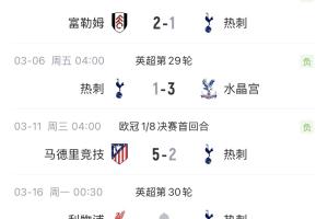 熱刺歐冠1/8決賽首回合2-5慘敗馬競,下周一周內將連續對陣利物浦、馬競(次回合)、森林。