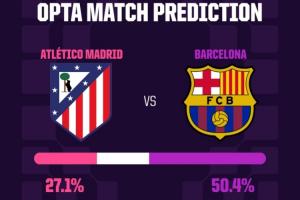 另一場1/4決賽,巴薩90分鐘內客場取勝的概率為50.4%,而馬競勝率只有27.1%。但就晉級而言,馬競被視為絕對熱門,晉級概率達到79.6%,巴薩翻盤的概率僅為20.4%。