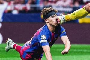 體育資訊04月15日訊 歐冠1/4決賽次回合,馬競vs巴薩,第26分鐘,費爾明頭球攻門,隨后被穆索踢到頭部,倒地撞向地面,當場血崩!