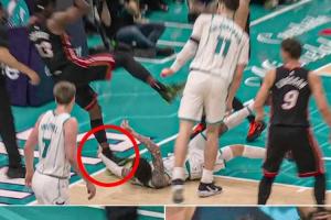 GIF-這動作不好!三球用手扒阿德巴約腳后跟致其倒地受傷,已回更衣室!