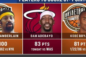 體育資訊03月11日訊 NBA常規(guī)賽,熱火150-129擊敗奇才。阿德巴約單場砍下83分,超越科比NBA歷史第2。