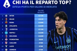 德轉列意甲各隊防線總身價排行:國米2.7億歐居首,米蘭第二