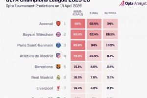 OPTA對拜仁、阿森納等隊的晉級概率進行了預(yù)測,拜仁晉級概率83.4%,阿森納晉級概率88%,也就是說皇馬的晉級概率僅為16.6%,葡萄牙體育則低至12%。