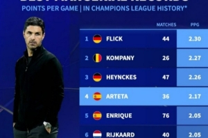 歐冠歷史主帥場(chǎng)均積分榜:弗里克居首,孔帕尼次席,阿爾特塔第四