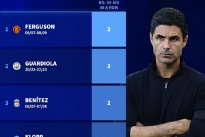 統計表明,阿爾特塔成為歷史上第五位連續帶隊進入歐冠四強的英超主教練,在他之前,只有弗格森(2006-07賽季至2008-09賽季連續3次)、瓜迪奧拉(2020-21賽季至2022-23賽季連續3次)、貝尼特斯(2006-07賽季至2007-08賽季連續2次)和克洛普(2017-18賽季至2018-19賽季連續2次)做到過。