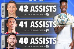 體育資訊04月16日訊 歐冠1/4決賽次回合,皇馬3-4總比分4-6不敵拜仁被淘汰,維尼修斯助攻姆巴佩破門,據(jù)統(tǒng)計這是維尼修斯在歐冠的第31次助攻,升至歷史第5。