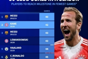 體育資訊4月16日訊 德轉(zhuǎn)盤點了在本世紀五大聯(lián)賽球員單賽季達成50粒進球最快紀錄榜,其中本賽季凱恩42場位列次席。具體如下: