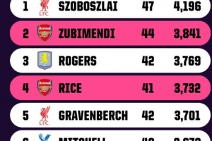 體育資訊4月17日訊 OPTA對英超球員本賽季各項賽事出場時間進行了統計,利物浦的索博斯洛伊以4196分鐘居首,阿森納兩將蘇維門迪和賴斯位居第2和第4位,兩人出場時間分別為3841分鐘和3732分鐘。
