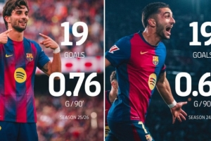 巴薩官方也曬出數據對比照,表示費蘭本賽季已打進19球,追平他個人上賽季的總進球數。與此同時,費蘭的每90分鐘進球數也從上賽季的0.64球升至本賽季的0.76球。