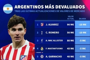 體育資訊4月17日訊 德國轉會市場更新了球員的身價,列出了阿根廷球員身價下跌榜,阿爾瓦雷斯、羅梅羅下跌1000萬歐最多。