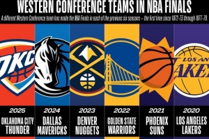 體育資訊4月17日訊 NBA官方今天分享了一個數(shù)據(jù):過去六個賽季,每年都有不同的西部球隊闖入NBA總決賽。這是1972-73賽季至1977-78賽季以來首次出現(xiàn)如此局面。