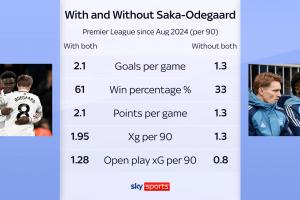 天空體育數據統計顯示,自2024年8月以來,當薩卡和厄德高同時出戰時,阿森納英超場均打進2.1球、勝率61%、場均2.1分、預期進球值1.95、運動戰預期進球值1.28。