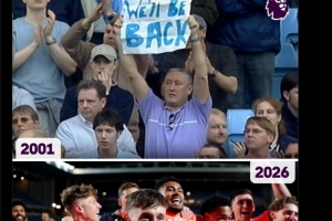 英超官方社媒曬出考文垂2001年、2026年的對比照片,對考文垂表示祝賀。2001年的照片中,考文垂球迷舉起的標語寫著:“我們會回來的!”