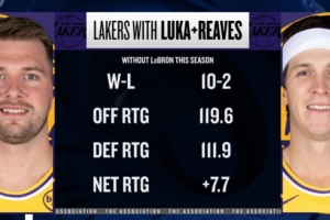 本賽季詹姆斯缺席而東契奇、里夫斯出戰時,湖人10勝2負