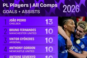 體育資訊3月8日訊 Squawka統計了2026年英超球員各賽事參與進球數量,并列出榜單,若昂·佩德羅參與13球居首,B費、約克雷斯、戈登、塞梅尼奧參與10球。