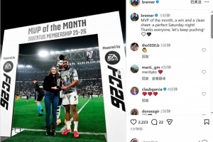 布雷默當選尤文2月份最佳球員,賽前他領取了獎杯,賽后布雷默社媒曬出領獎照片,并寫道:“月最佳球員、勝利和零封,一個完美的周六之夜!感謝所有人,讓我們繼續(xù)加油!”