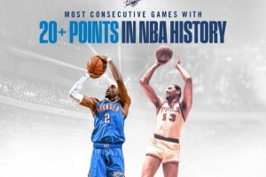 這樣,亞歷山大連續127場至少20分,正式超越1961-63賽季的張伯倫(126場),登頂NBA歷史第一。