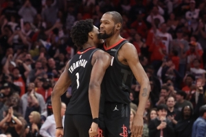 本場比賽杜蘭特出戰(zhàn)40分鐘,投籃24中13,三分球7中3,罰球4中3,砍下32分6籃板5助攻1搶斷1蓋帽;阿門也出戰(zhàn)40分鐘15投7中(三分3中2)、罰球8中7,砍下23分12籃板(6個(gè)前板)8助攻1搶斷。