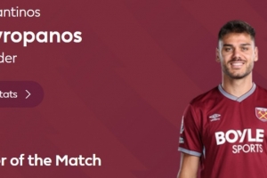本場比賽西漢姆球員馬夫羅帕諾斯打進(jìn)一球,賽后當(dāng)選英超官方球迷票選全場最佳球員。