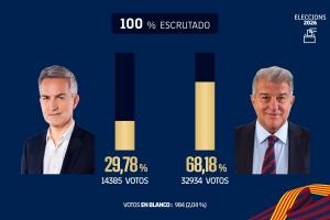 體育資訊3月16日訊 每體報(bào)道,拉波爾塔在巴塞羅那俱樂(lè)部主席選舉中再次大獲全勝,獲得32934票,占總票數(shù)的68.18%。維克托·豐特以14385票(29.78%)位居第二。