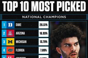 據統計,杜克大學目前是奪冠最大熱門,支持率高達26.51%位居榜首。亞利桑那大學(16.93%)和密歇根大學(13.79%)分列二三。之后是佛羅里達大學、休斯敦大學、岡薩加大學、普渡大學、康涅狄格大學、阿肯色大學和愛荷華州大。排在前四的正是四大賽區的一號種子。
