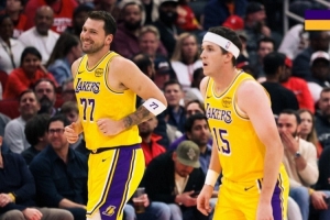 賽后湖人官推發(fā)布贏球海報,封面為東契奇和里夫斯。