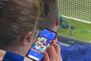 歐冠1/8決賽次回合,切爾西主場0-3巴黎圣日耳曼(總比分2-8),看臺上的一位切爾西球迷玩起了游戲。